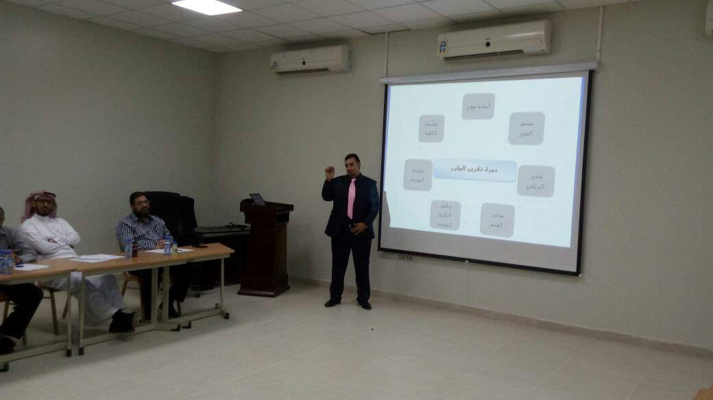 قدم الورشة الدكتور / أحمد محمد شبيب منسق وحدة الجودة بالكلية ، حيث قدم شرح وافى عن كيفية إعداد التقرير للمقررات الدراسية للبرامج الأكاديمية .