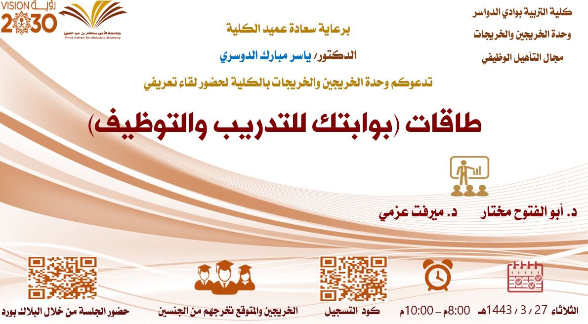 في إطار حرص كلية التربية بوادي الدواسر على تهيئة الخريجين والمتوقع تخرجهم للتأهيل الوظيفي لسوق العمل السعودي، وبتوجيهات عميد الكلية الدكتورياسر بن مبارك الدوسري نظمت وحدة الخريجين بالكلية ممثلة في المجال الوظيفي ورشة تدريبية بعنوان: "طاقات (بوابتك للتدريب والتوظيف)" تم تنفيذها عن بُعد من خلال منصة Blackboard Collaborate Ultra وذلك يوم الثلاثاء ١٤٤٣/٣/٢٧هـ الموافق ٢٠٢١/١١/٢م ، تم افتتاح اللقاء بكلمة ألقاها المشرف على وحدة الخريجين الدكتور فيصل العثيمين ، واشترك في تقديم الورشة كل من الأستاذ المشارك بقسم العلوم التربوية الدكتور أبو الفتوح مختار القراميطي، والأستاذ المشارك بقسم التربية الخاصة الدكتورة ميرفت زكي عبد الجواد .